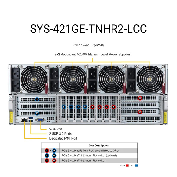 سرور SYS-421GE-TNHR2-LCC یک راهکار پیشرفته پردازش GPU از Supermicro است. این سرور با فرمفاکتور 4U و قابلیت Liquid Cooling Capable (LCC) طراحی شده تا در شرایط کاری ۲۴/۷ پایدار باقی بماند. ترکیب پردازندههای نسل چهارم Intel Xeon Scalable و کارتهای NVIDIA H100/A100 آن را به انتخابی ایدهآل برای پروژههای هوش مصنوعی، HPC، تحلیل کلانداده و پردازش ابری تبدیل کرده است.