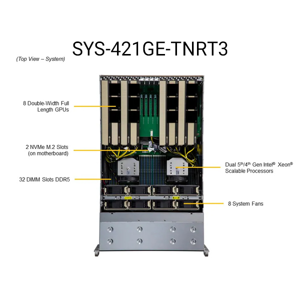 سرور Supermicro SYS-421GE-TNRT3 یک سرور GPU رک‌مونت 4U پیشرفته است که برای هوش مصنوعی (AI)، یادگیری عمیق، HPC و دیتاسنترهای سازمانی مدرن طراحی شده است. این سرور با پشتیبانی از پردازنده‌های نسل چهارم Intel Xeon Scalable (Sapphire Rapids) و کارت‌های NVIDIA H100 / A100، قدرت پردازشی فوق‌العاده و عملکرد پایدار حتی در سنگین‌ترین بارهای کاری ارائه می‌دهد.