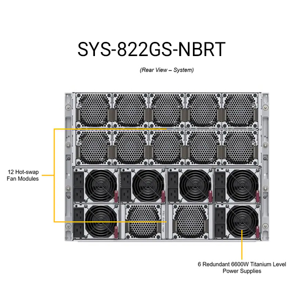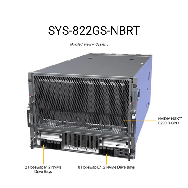 سرور Supermicro SYS-822GS-NBRT بهعنوان یکی از پیشرفتهترین سرورهای 8U در ردهی GPU Server، بارهای کاری بسیار سنگین را با نهایت توان پردازش میکند. این سرور دو پردازنده Intel Xeon سری 6700/6500 را پشتیبانی میکند و به شما اجازه میدهد تا 8 کارت گرافیک NVIDIA HGX B200 را نصب کنید. به همین دلیل، مراکز تحقیقاتی و سازمانها میتوانند آن را برای اجرای پروژههای هوش مصنوعی (AI)، یادگیری عمیق (Deep Learning)، پردازش مدلهای زبان بزرگ (LLM)، HPC و تحلیل دادههای علمی انتخاب کنند.